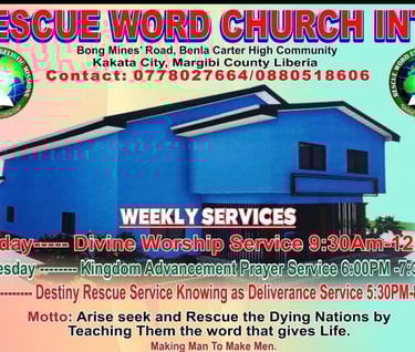 In 2012, in the nation of Liberia, God spoke a clear and compelling mandate to Apostle John Gwee: “Arise, seek and rescue the dying nations by teaching them the word that gives life.” This divine vision was a call to action—a rescue mission rooted not in human effort, but in the life-changing power of God’s Word.After a season of dedicated prayer and seeking divine direction, obedience set the course. In 2013, led by the Holy Spirit, Apostle John Gwee began a fellowship centered on this rescue mandate. What started as a faithful response to God's voice quickly grew into what is now Rescue Word Church.From that initial step of obedience, a transformative journey began. The ministry, founded on the unwavering commitment of Apostle John and his wife, Rosanna Gwee, has been a beacon of hope and renewal. By faithfully teaching the Word that gives life, we have witnessed firsthand the restoration of broken lives, the redirection of destinies, and the awakening of purpose in countless individuals.God has faithfully multiplied the work of our hands. From our beginnings in Liberia, West Africa, the ministry has expanded to include a second branch there, and by God's grace, has crossed continents to establish two thriving branches in Malawi, East Africa. Each branch stands as a testament to what God can do through willing and obedient hearts.Today, Rescue Word Church continues to operate under that same founding mandate. We are more than a network of churches; we are a movement of rescue, committed to seeing nations transformed by the truth of the Gospel. Our history is still being written, as every life touched, every destiny altered, and every community impacted adds a new chapter to this story of God's faithfulness. We invite you to join us in this continuing mission, as we walk in obedience, teaching the Word, and rescuing lives for God’s glory.
