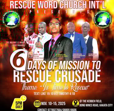 Rescue Word Church International's "Mission To Rescue Healing Crusade" is a powerful encounter rooted in God's Word, where His promise to heal, deliver, and set free is evident. As Acts 10:38 declares, "God anointed Jesus of Nazareth with the Holy Spirit and power, who went about doing good and healing all who were oppressed by the devil." During these crusades, we believe in the divine power of Jesus Christ to bring wholeness and freedom to every life, fulfilling His mission to rescue and restore. Join us as we witness God's miraculous works and experience His love and mercy firsthand. Join us in Liberia for the 'Mission To Rescue Healing Crusade,' where God's power will be at work to heal the sick, deliver the oppressed, and set the captives free. As Psalm 107:20 affirms, 'He sent His word and healed them, and delivered them from their destruction.' We believe that through faith in Jesus Christ, miraculous breakthroughs will occur, restoring hope and transforming lives in the land of Liberia